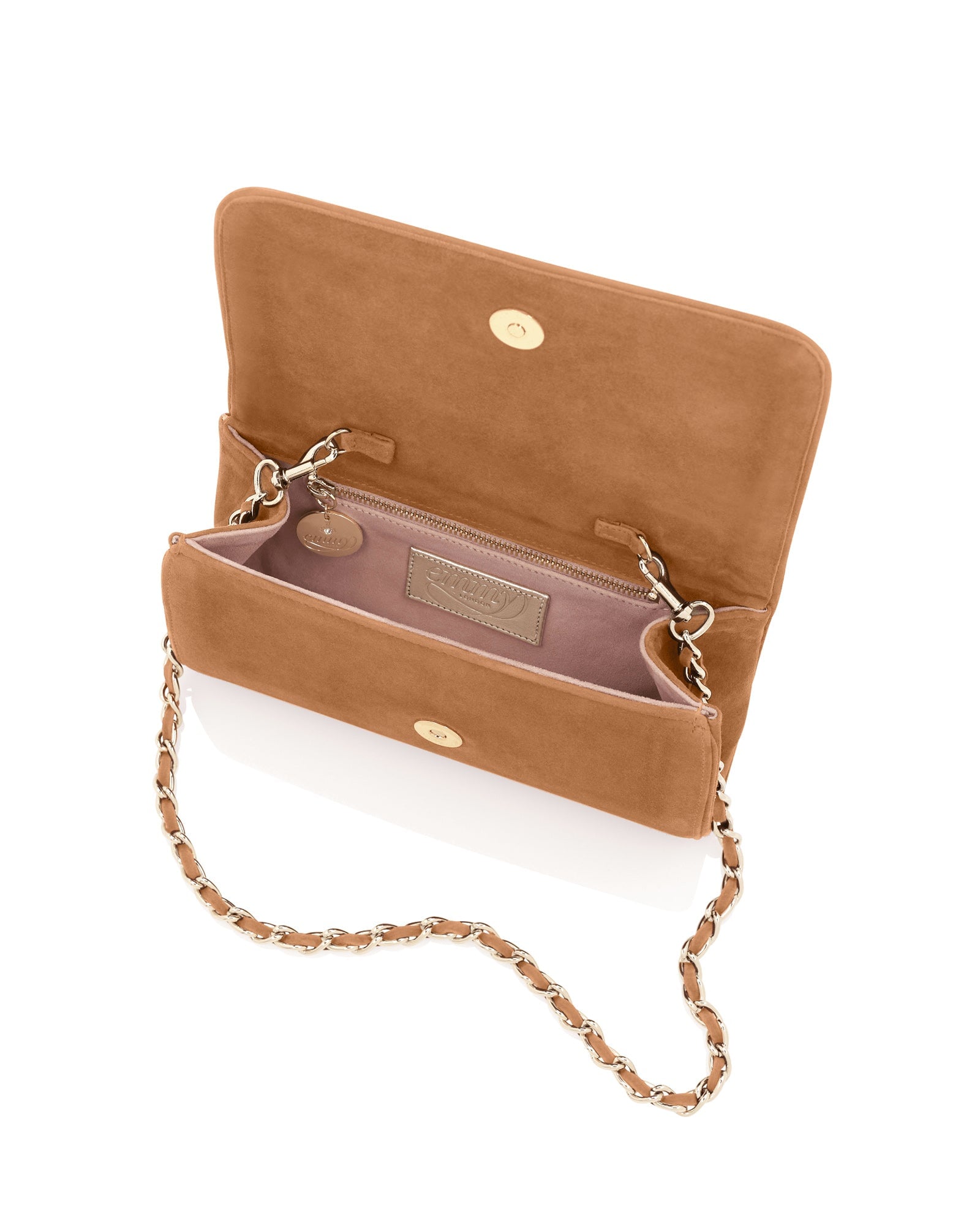 This elegant handcrafted saddle brown clutch opens to reveal a soft neutral oyster suede lining and zip pocket. The clutch is spacious enough for your essentials and fastens with a secure magnetic popper. The warm saddle shade is a flattering tone and looks great with creams, neutrals and green shades. The luxury clutch bag comes with a handy detachable gold and leather chain strap.