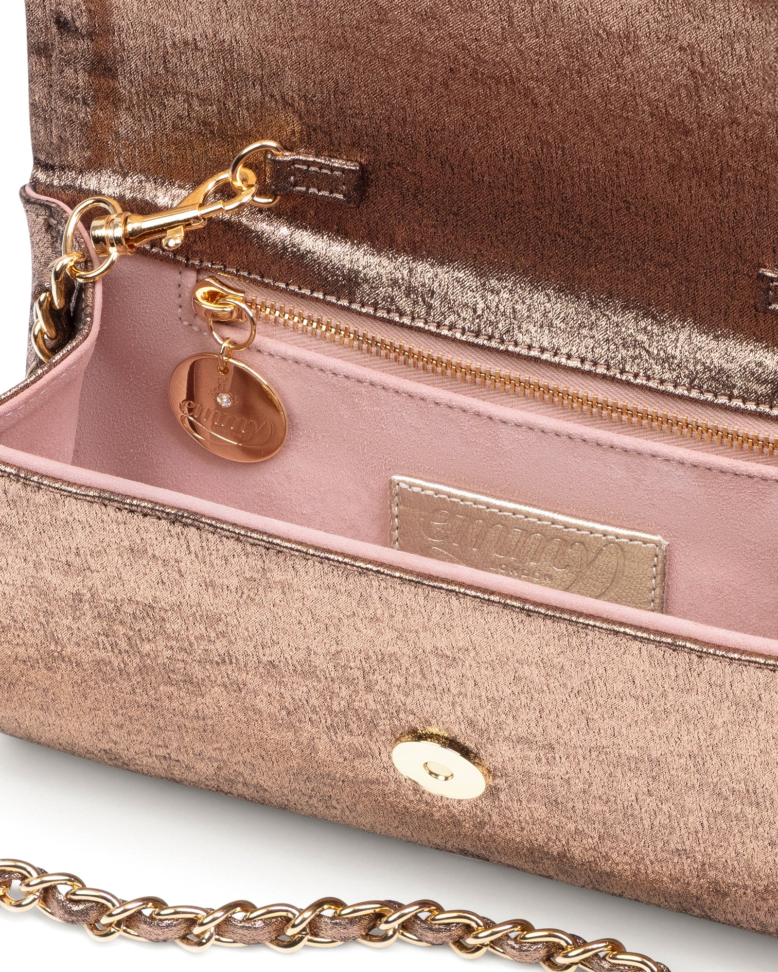 Introducing the timeless Natasha Clutch Bag in stunning bronze metallic leather, a luxury occasion bag, handmade with the finest Italian leather and soft suede. This elegant clutch bag is beautifully lined with signature oyster suede and features a discreet zip pocket to keep your essentials perfectly organised. A concealed gold magnetic clasp ensures secure closure while maintaining a sleek silhouette.