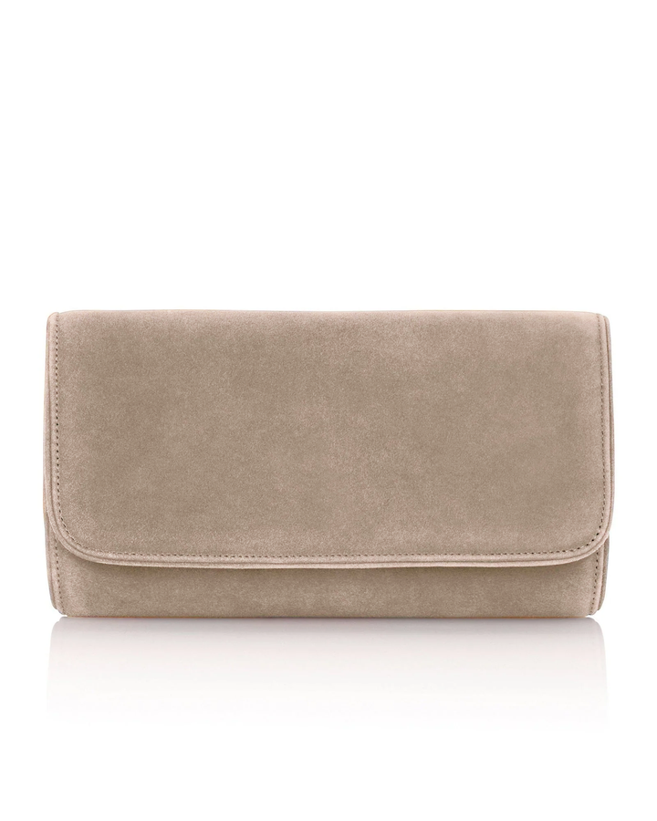 Natasha Cashmere is a timeless accessory handcrafted in our beautifully soft cashmere suede. This elegant clutch opens to reveal a luxurious oyster suede lining and a zip pocket for your essentials. Designed with versatility in mind, it features a detachable gold and suede chain strap for hands-free styling. Whether paired with pastels, neutrals, or bold hues, this classic piece is the perfect finishing touch for weddings, garden parties, and summer soirées.