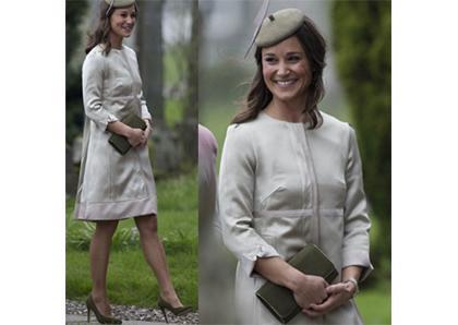 Pippa wore Emmy London Poppy court shoes and the 'Natasha' clutch in khaki. Her beautiful fascinator was crafted by Edwina Ibbotson and her outfit was by Suzannah.