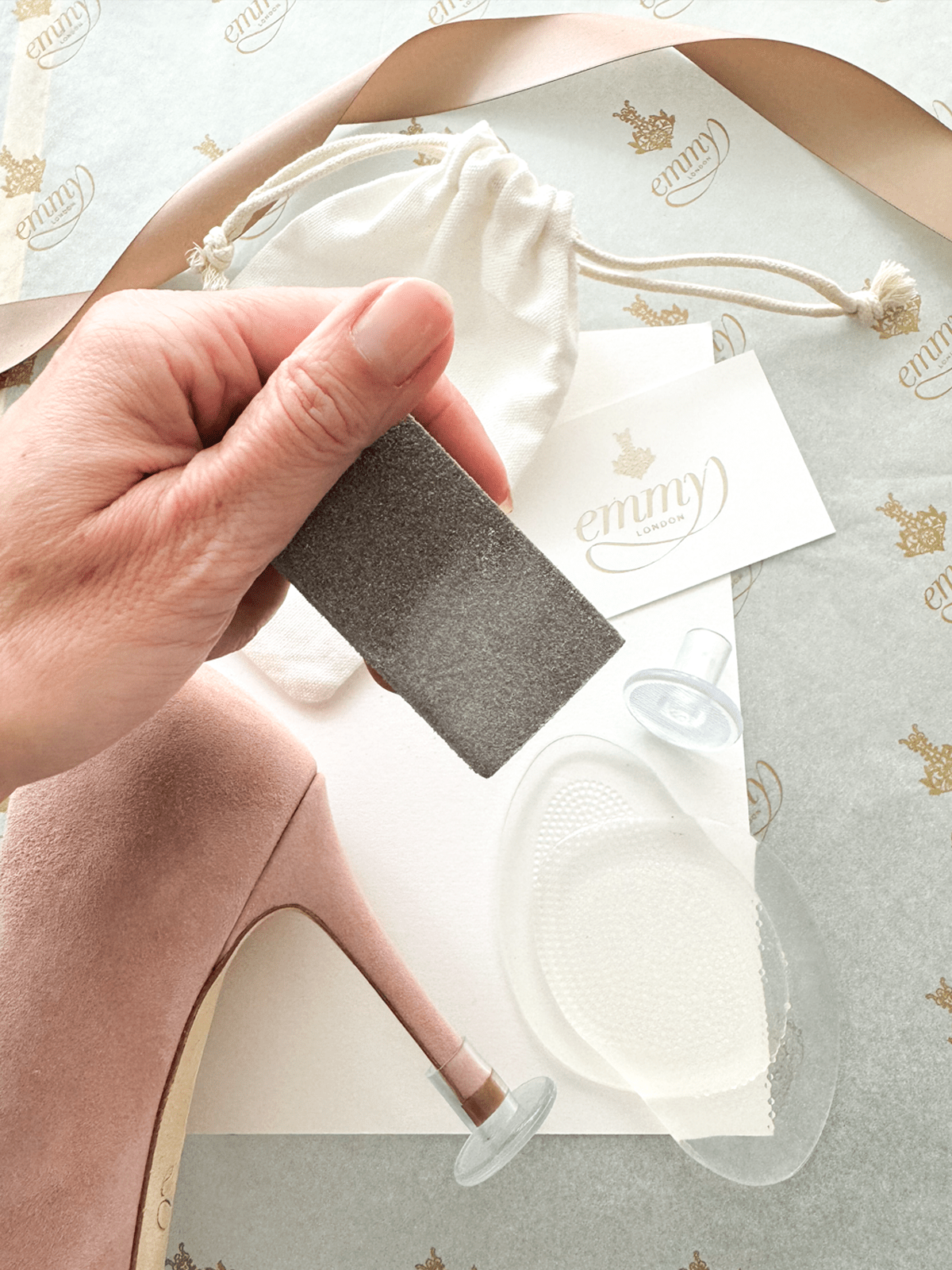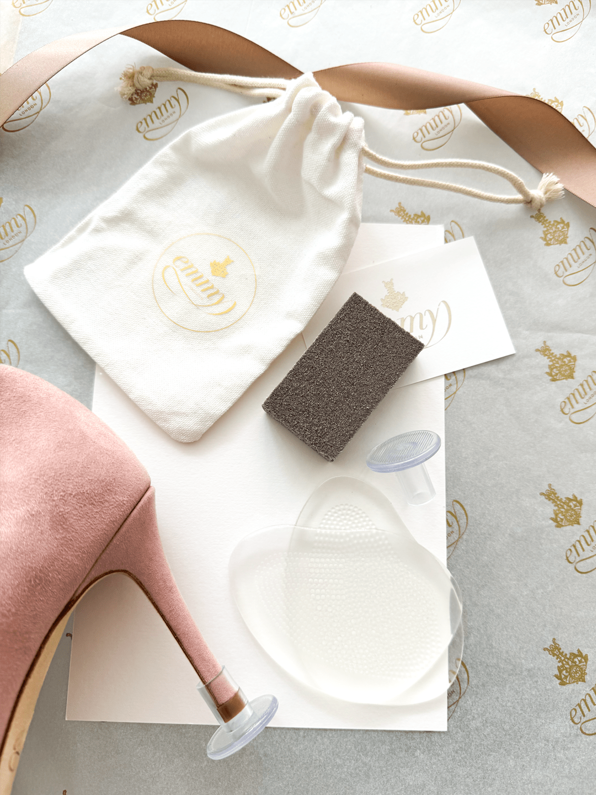 • One pair of reusable clear heel stoppers, a subtle addition to prevent your stiletto heels from sinking into the grass, ensuring clean heels and stability on uneven ground.