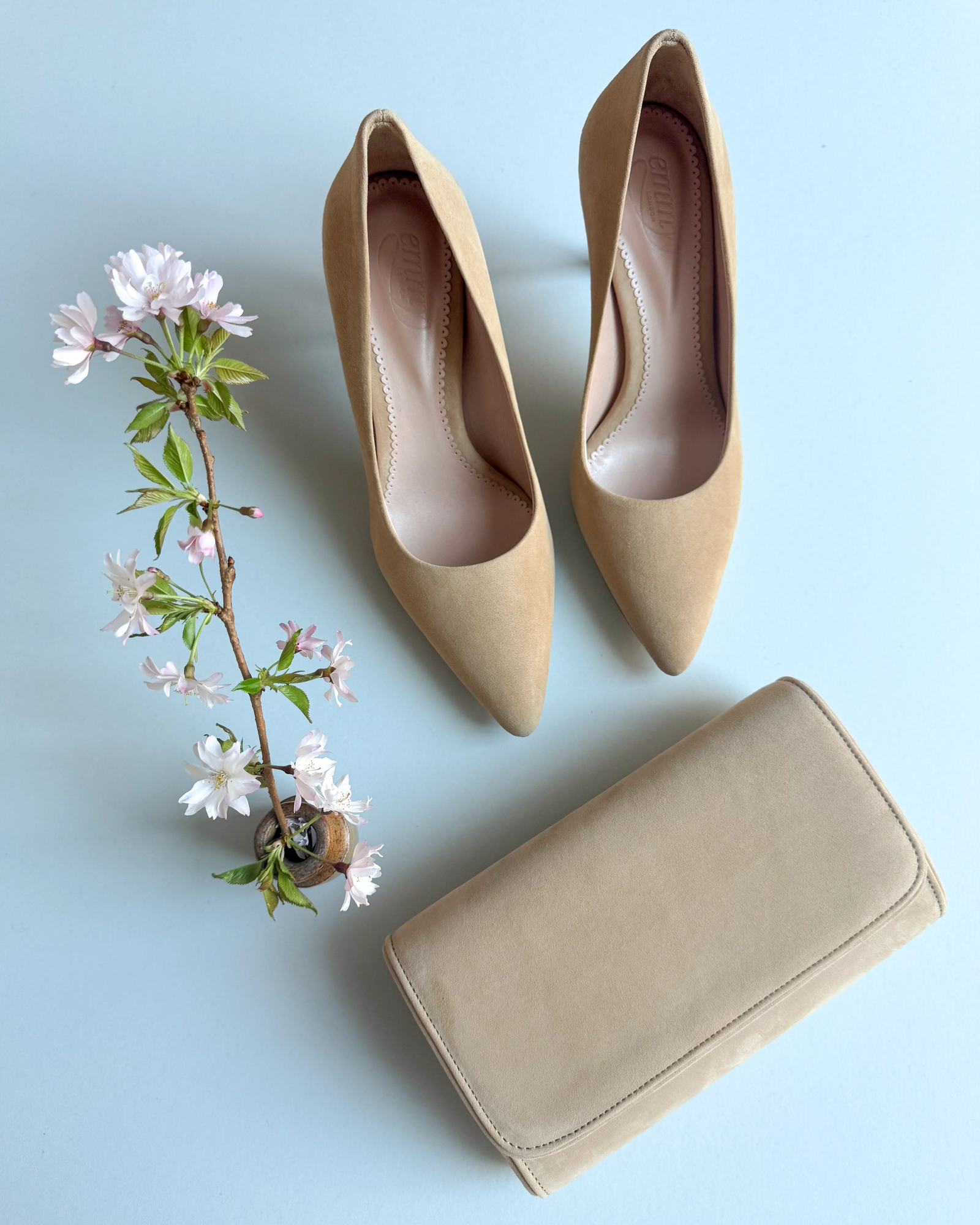 Claudia Latte is a timeless pointed court shoe crafted from luxurious suede in a warm, versatile hue. Featuring a flattering mid straight heel, it offers effortless elegance for both workwear and occasion dressing. Pair with neutrals, creams, or greens for a chic, tonal look. Complete your outfit with a matching suede bag for a refined finish.