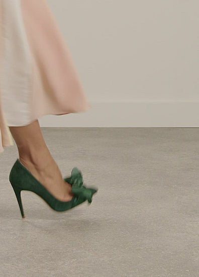 These sublime evening shoes have been designed by Emmy, especially for the party season. Florence Greenery sits on a slim 105mm heel. The flattering half d'Orsay silhouette is finished with a playful satin bow that can be re-tied to suit your style. Handmade using luxurious green suede that moulds beautifully to your feet, this high style is surprisingly comfortable, so you'll be able to dance all night!