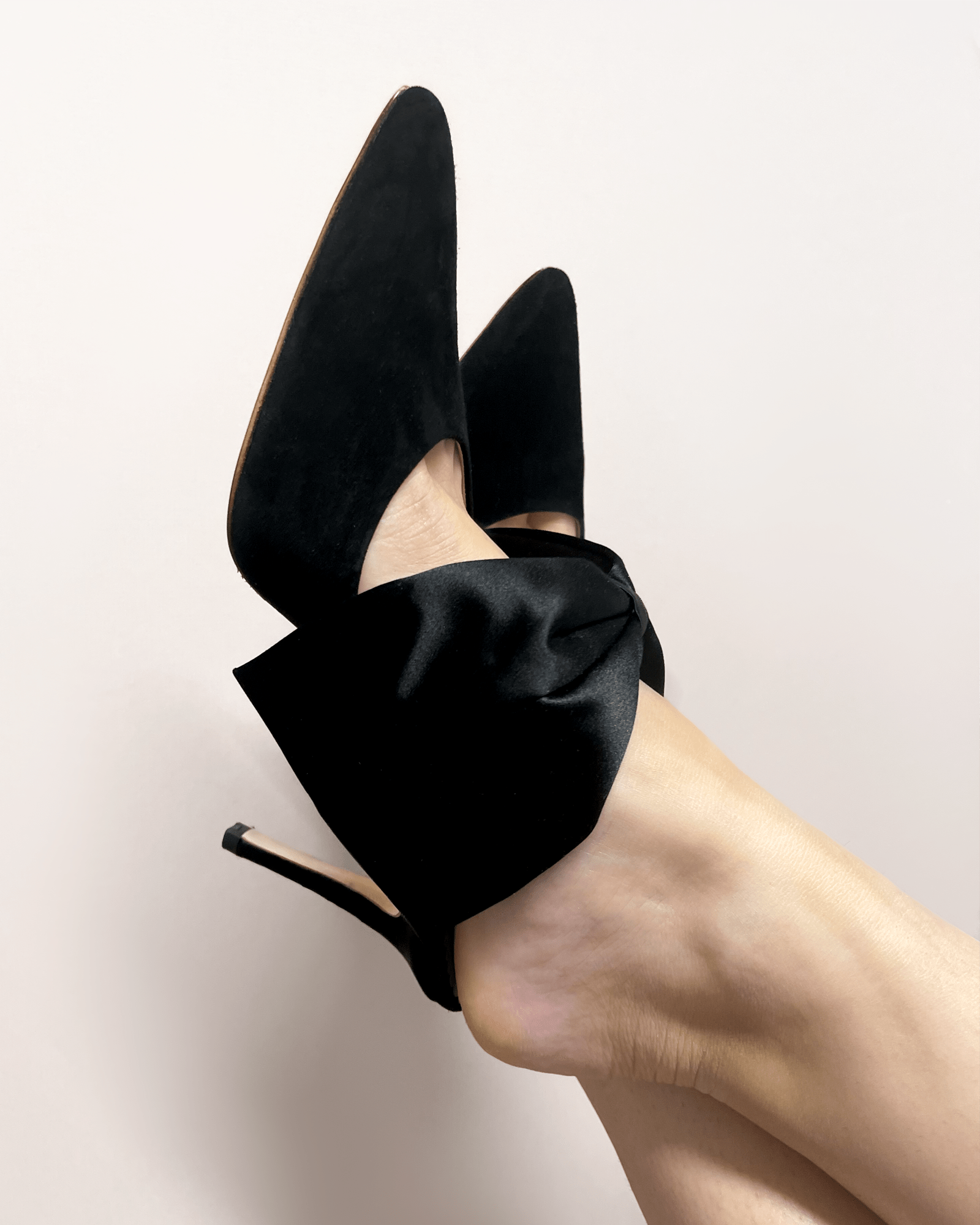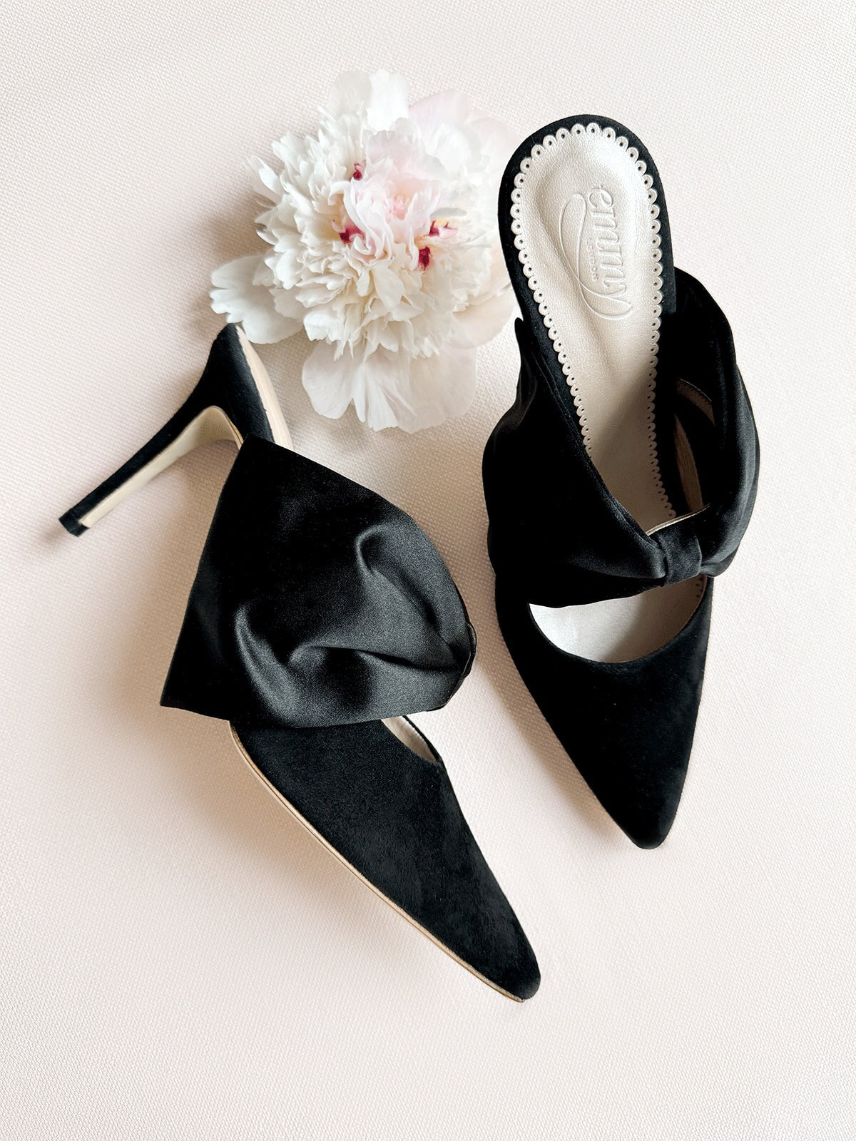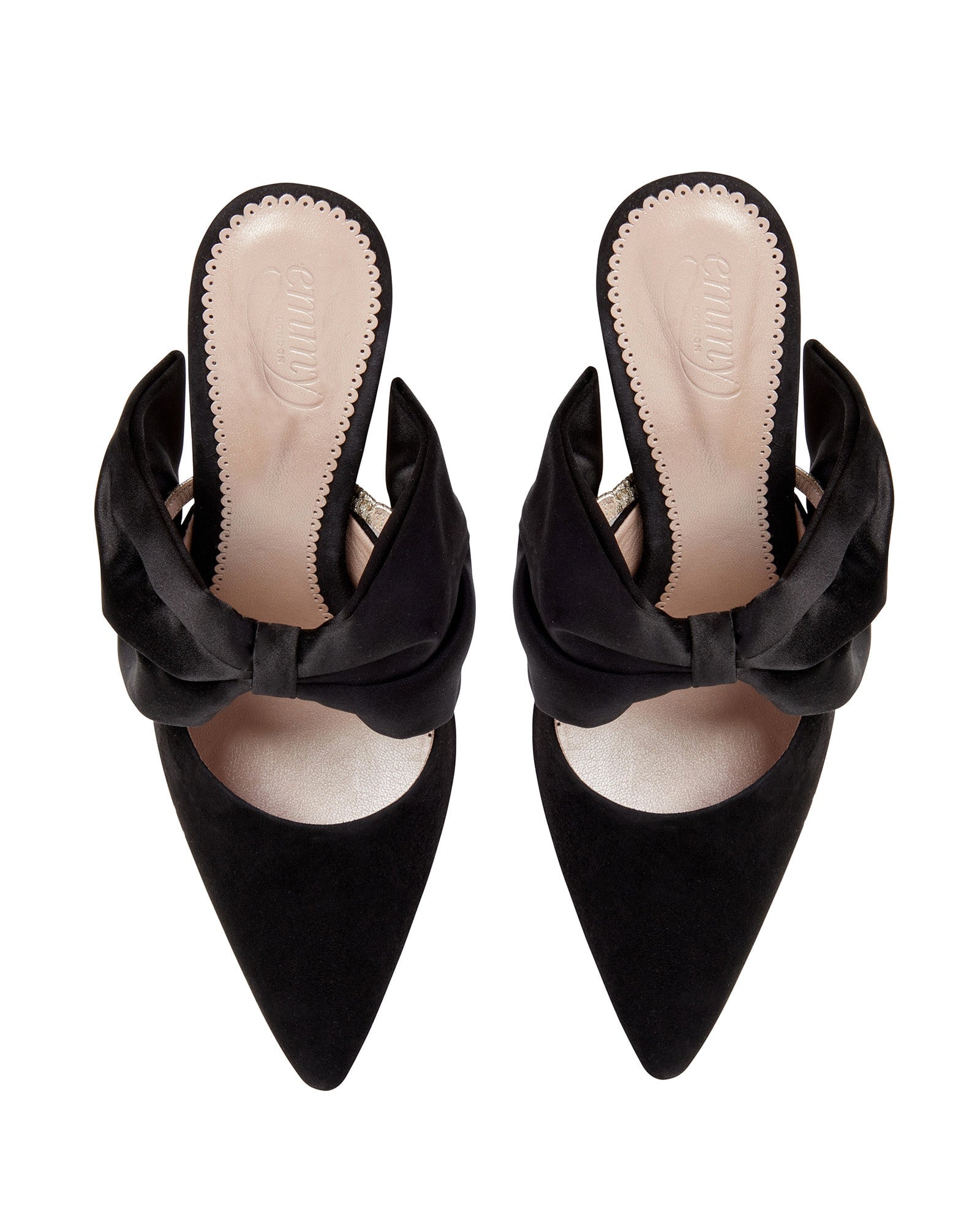 Our new style, Georgia Mid Heel in jet black suede with a beautiful bow, sits on a slim 85mm heel. The flattering mule silhouette is finished with a lustrous black silk satin bow secured onto the metallic leather strap for a show stopping finish!