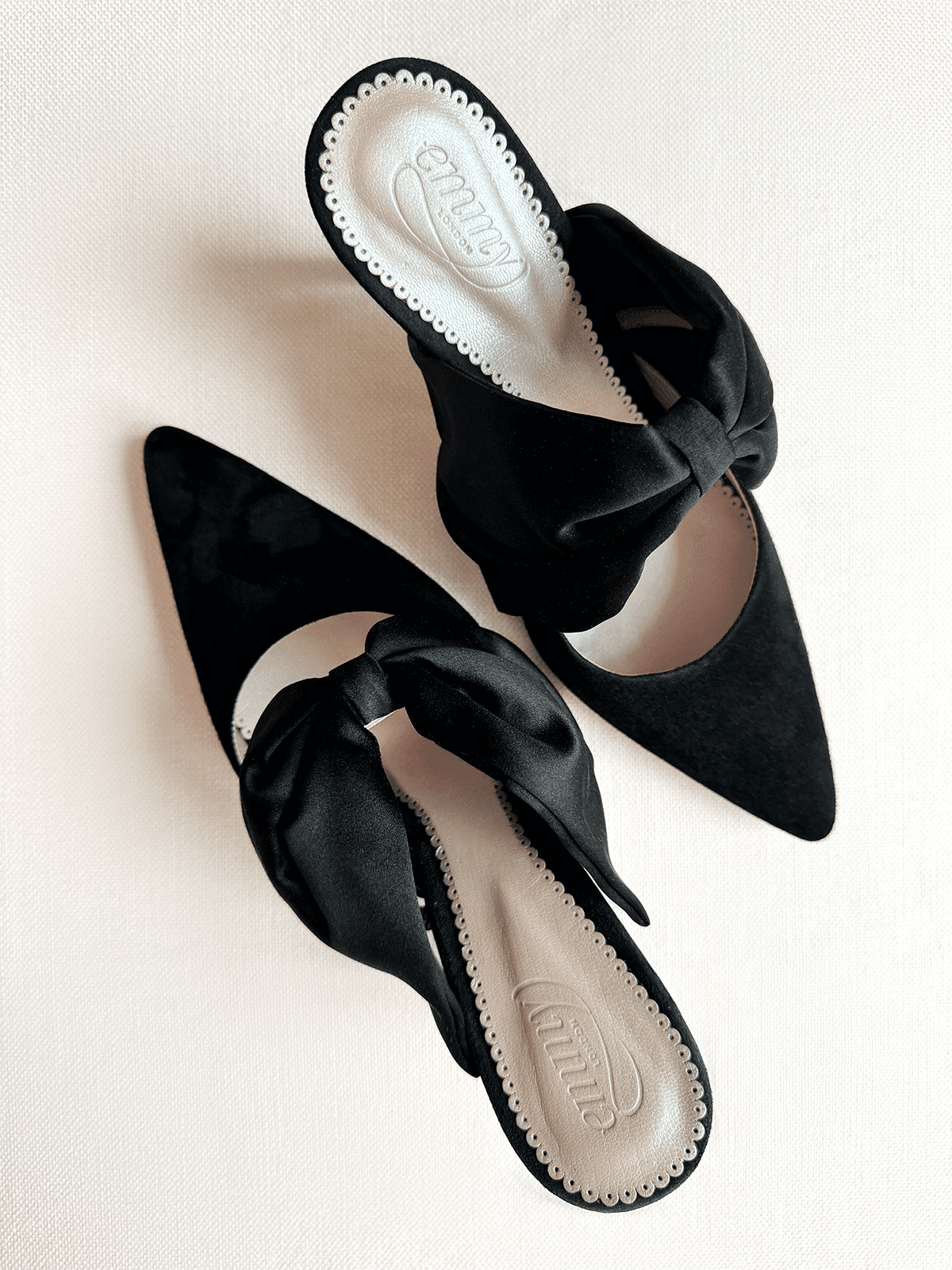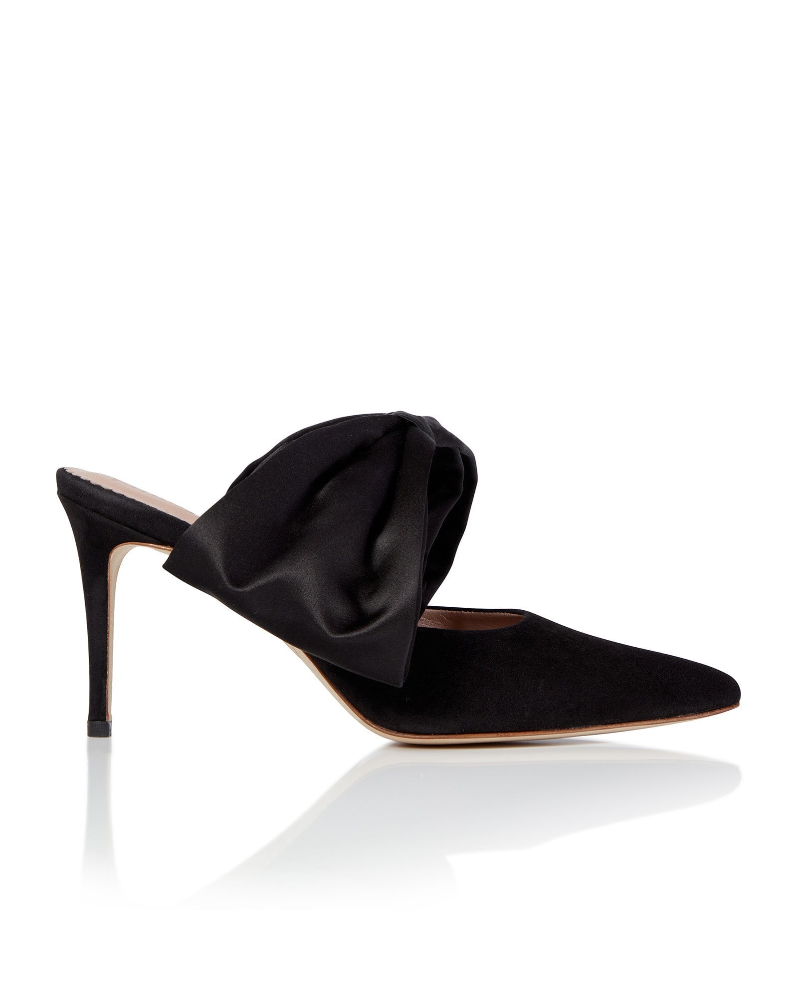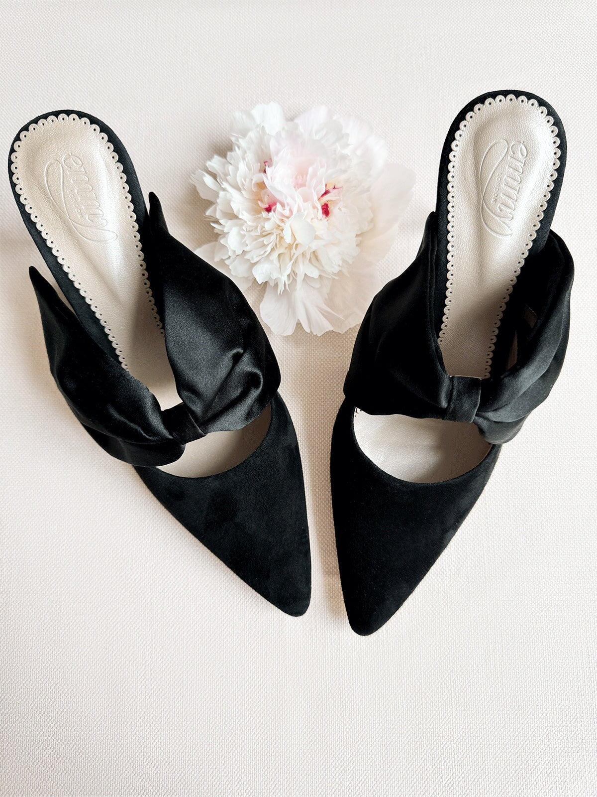 Our new style, Georgia Mid Heel in jet black suede with a beautiful bow, sits on a slim 85mm heel. The flattering mule silhouette is finished with a lustrous black silk satin bow secured onto the metallic leather strap for a show stopping finish!