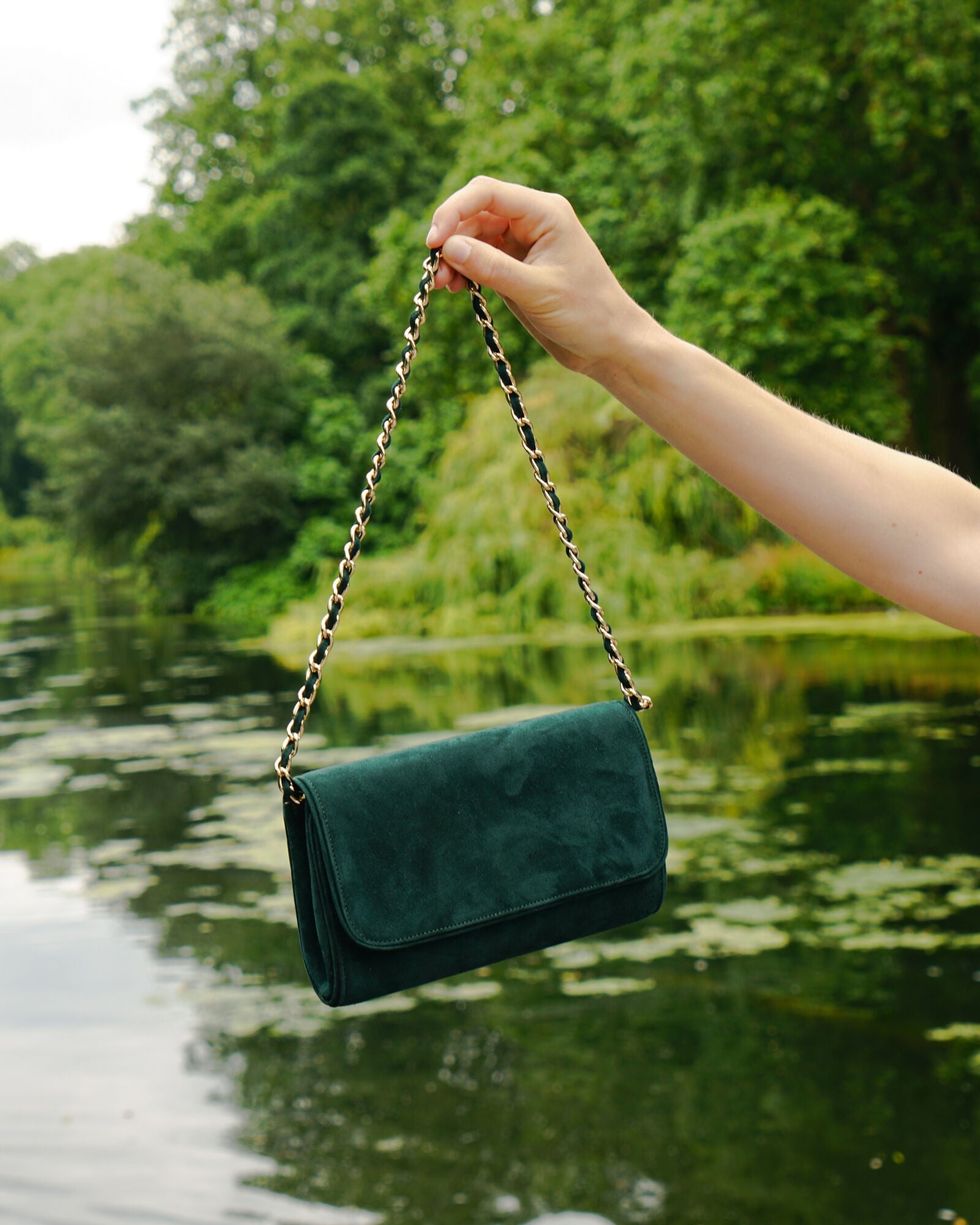 This elegant handcrafted dark green clutch opens to reveal a soft neutral oyster suede lining and zip pocket. The clutch is roomy enough for your essentials and fastens with a secure magnetic popper. The rich greenery shade works well with a variety of outfit options and is immensely popular with stylists and the press. There's handy detachable gold and leather chain strap. This super soft clutch is a must your festive event.Why not pair this clutch with our Josie Greenery court shoes.