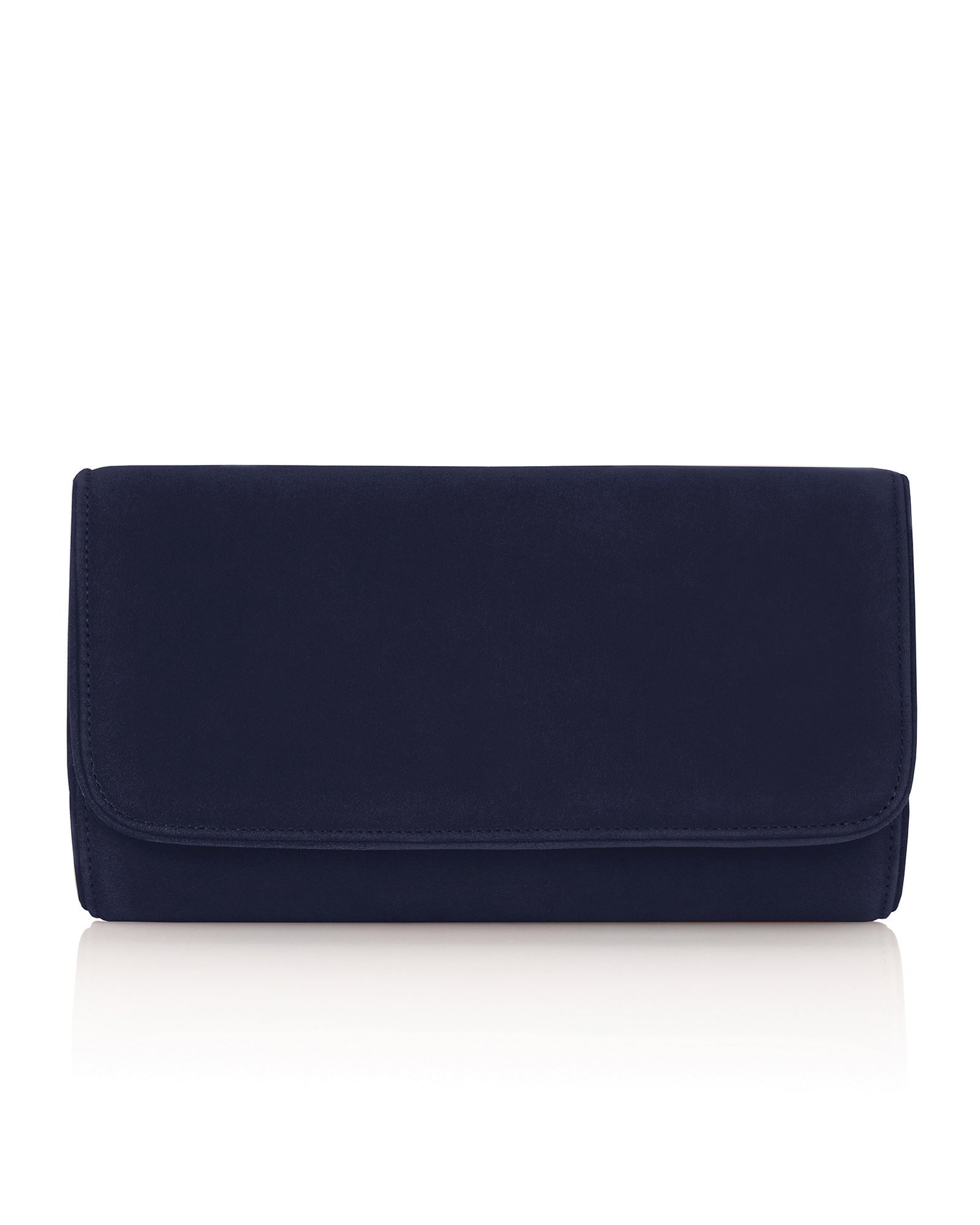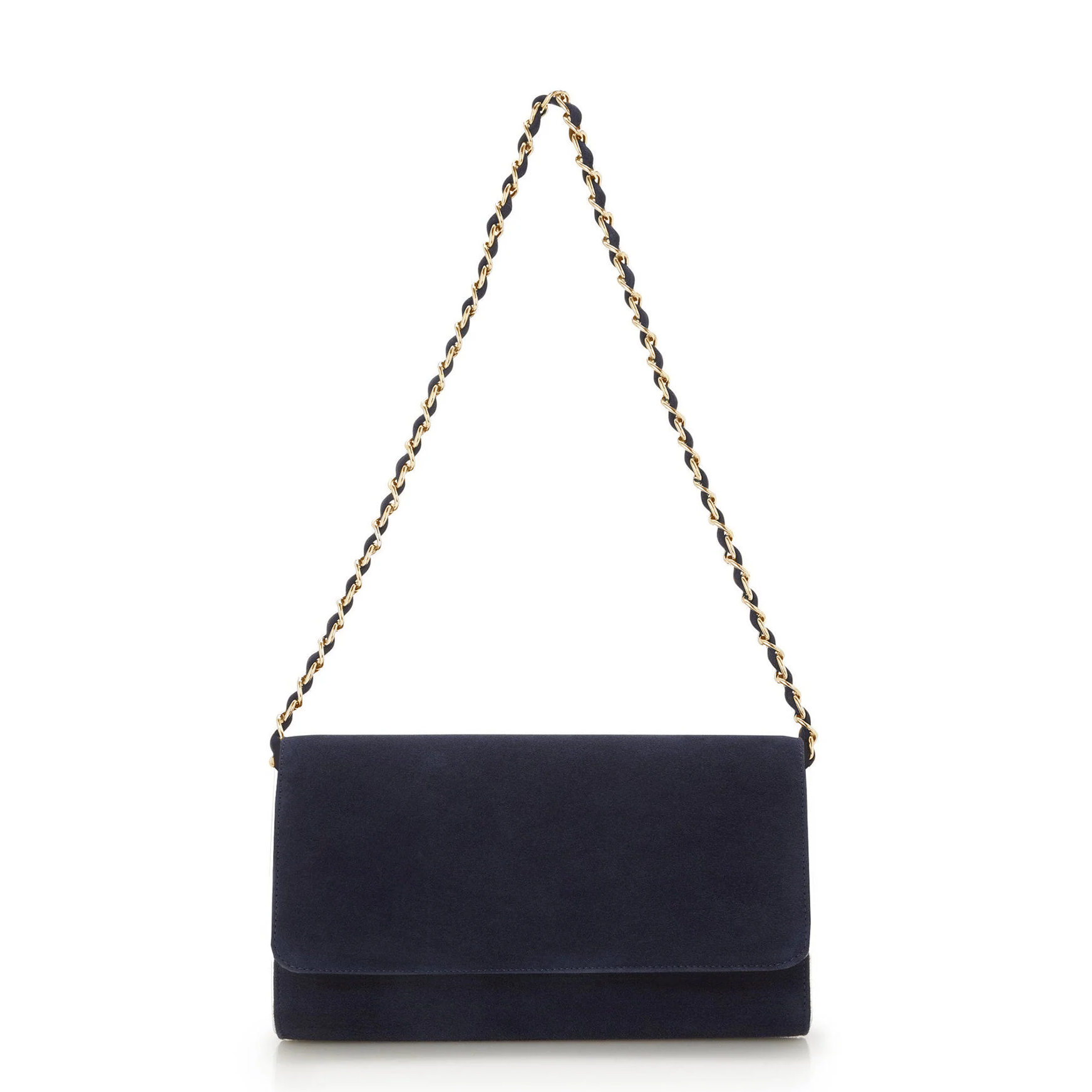A classic Emmy London kid suede clutch bag in a majestic midnight blue shade. This elegant handcrafted clutch opens to reveal a soft neutral oyster suede lining and zip pocket. The clutch is roomy enough for your essentials and fastens with a secure magnetic popper. The navy blue shade pairs well with a variety of outfit options and looks stunning with creams, blues and yellows. The clutch has a handy detachable gold and leather chain strap. This is a gorgeous, timeless shade that works all year round.