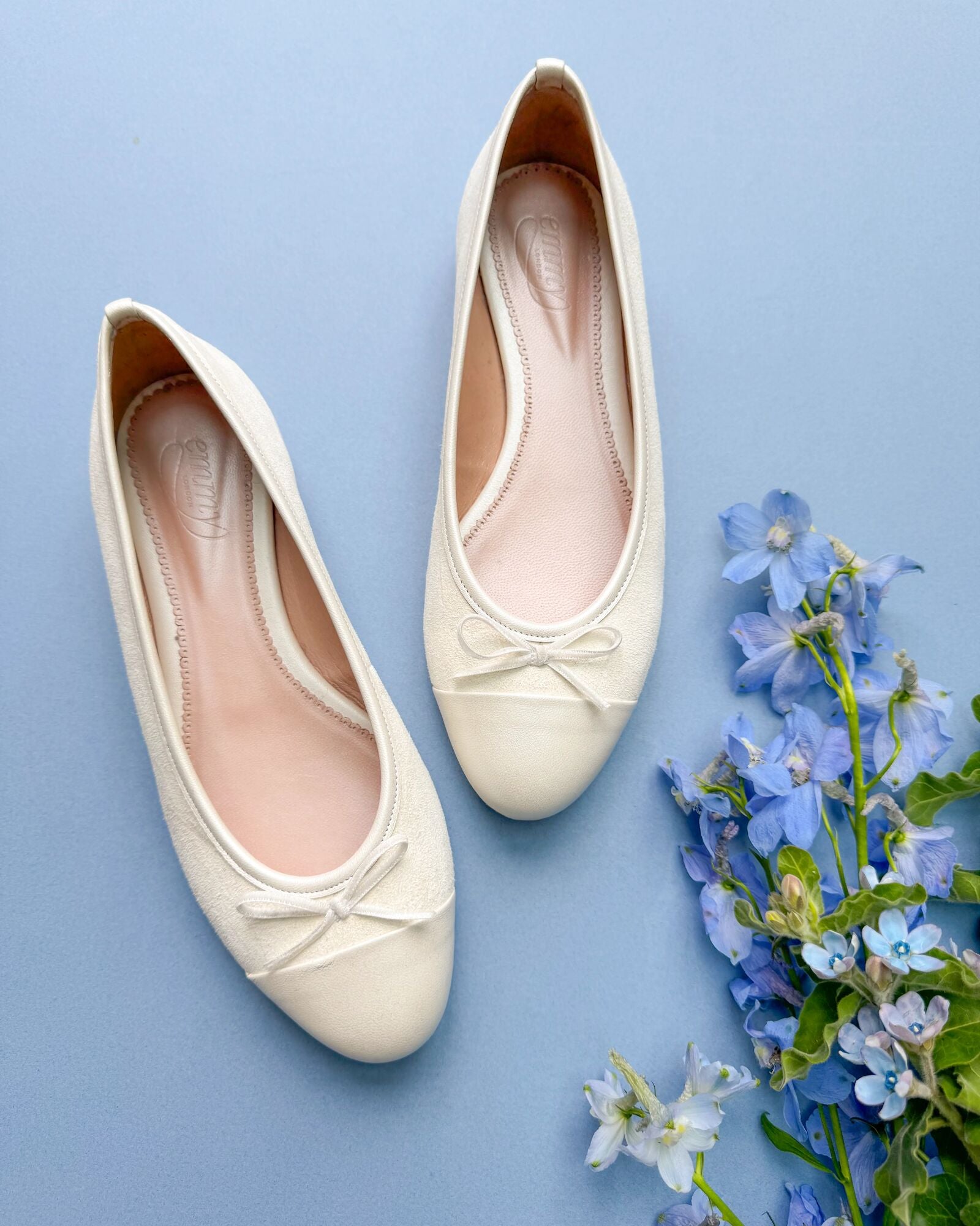Step into modern bridal elegance with our Cece Ivory Ballet Flat, designed for brides seeking a chic and effortless alternative to heels. Handmade in beautifully soft ivory suede and finished with a smooth leather toe cap, this timeless silhouette is elevated with a delicate bow crafted from VV Rouleaux luxury ribbon, adding a romantic, couture-inspired touch.